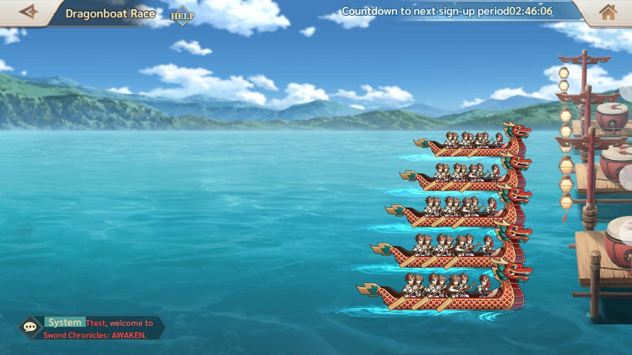 Dragonboat Race is a racing game. Before the start of the event, guild leaders should rally all members to come on board and speed up the dragonboat. Guild members can also spend a small number of meteorgems to speed up the dragonboat further. This allows the guild's dragonboat to start at a higher initial speed at the start of the race.