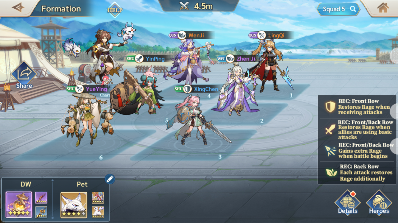 Many Shu Heroes can inflict negative effects on the enemies, especially YinPing. Her stun effect can make the opponent unable to move, which is very useful in battles. At the beginning of the battle, you can use YueYing's Bind to weaken the enemies, and then let Huang Zhong attack the enemy's back row and deal damage.